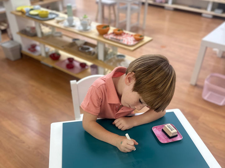 Language: In conventional education, literacy is delayed until kindergarten, but in a Montessori Children’s House, children as young as 2.5 begin building the foundations of reading and writing through hands-on, sensory-rich materials. Every area of the classroom indirectly supports language—from the pincer grip used with materials to the left-to-right, top-to-bottom order of activities. Step by step, skills are isolated and taught at the right developmental stage, allowing children to progress joyfully and naturally. By the end of the 3-year cycle, many read with comprehension and understand grammar beyond the level of their traditionally schooled peers.